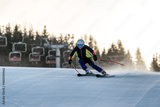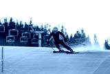 Skier skiing downhill on piste slope in mountain resort and ski-lift at background