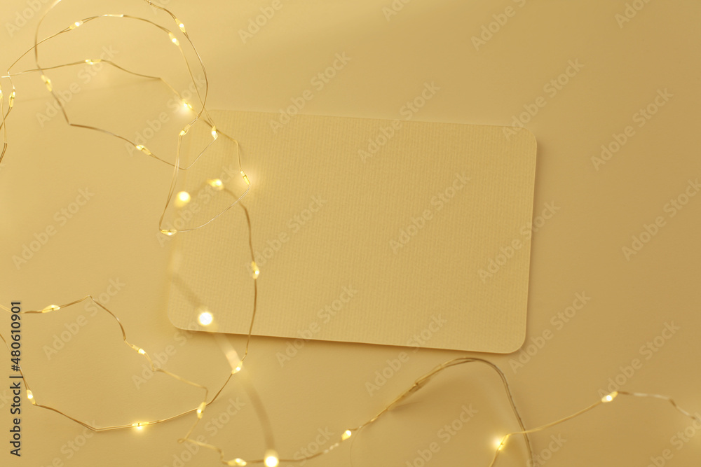 Empty Blank texture canvas paper card with white glow garland. Light and shadows minimalism style template copy space background. Flat lay, top view.