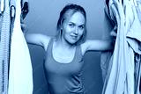 Happy young white woman looks out from behind clothes hanging on a hanger, smiles at the camera, is satisfied with the choice of purchases, buys a summer wardrobe in bed color