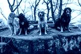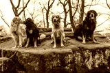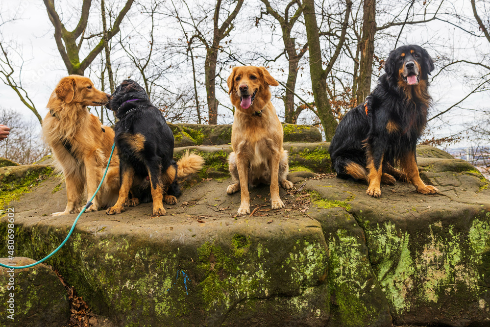 a nice group of four hovawart with different colouring posing on a rock