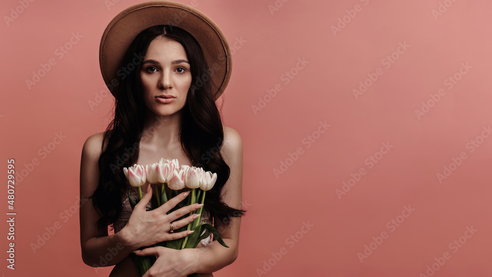 Photo portrait of a young woman smiling, holding a bouquet of tulips, isolated against a pastel pink background. A place for your text.