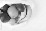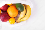 Delivery healthy food background. Vegan vegetarian food in fabric bag fruits on white, copy space, banner
