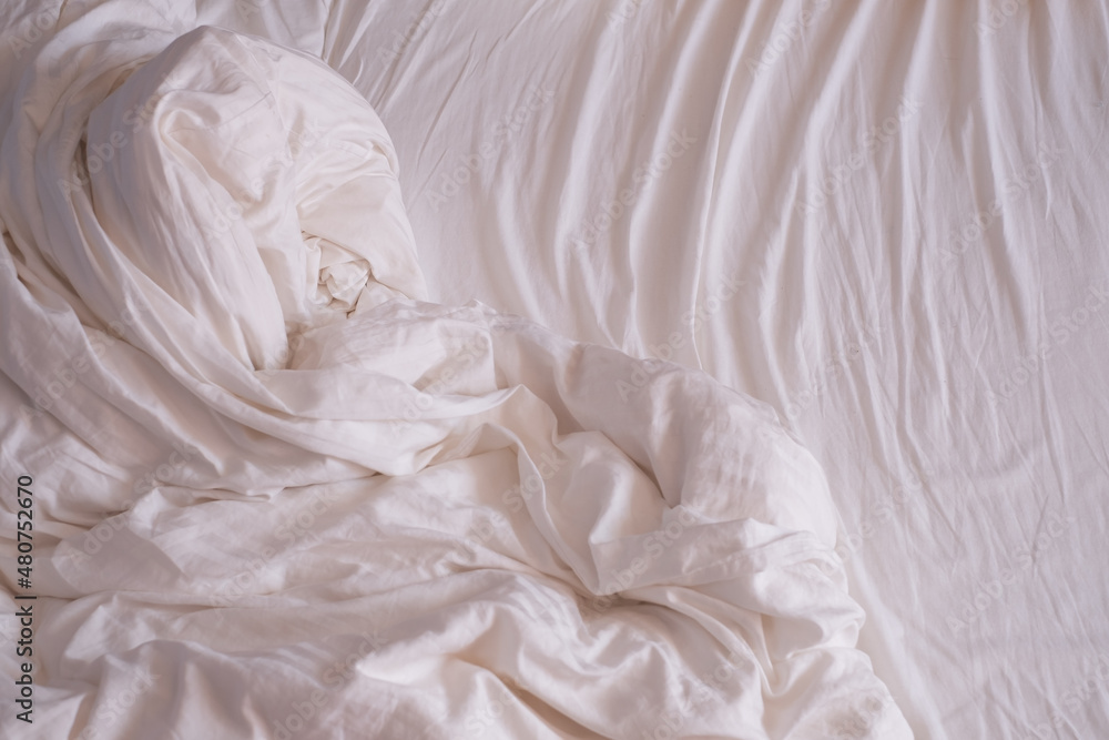 Beautiful white shiny crumpled fabric sheets on the bed.