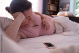Caucasian woman with phone having labor contractions on sofa at home and breathing
