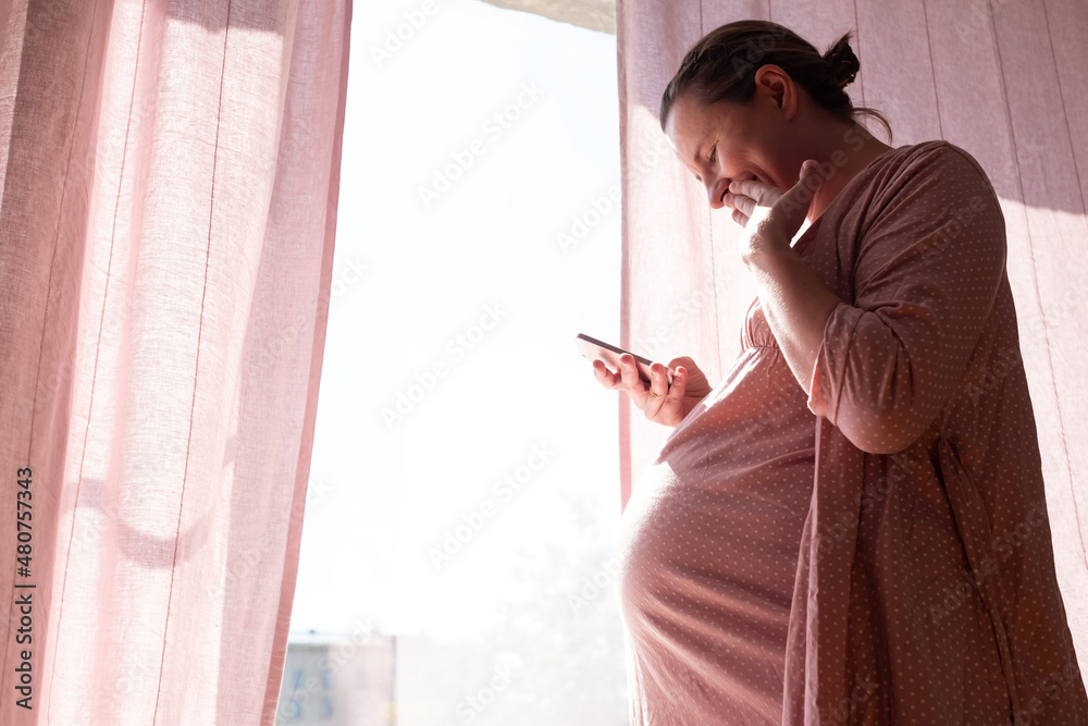 Happy pregnant caucasian woman reading sms smiling