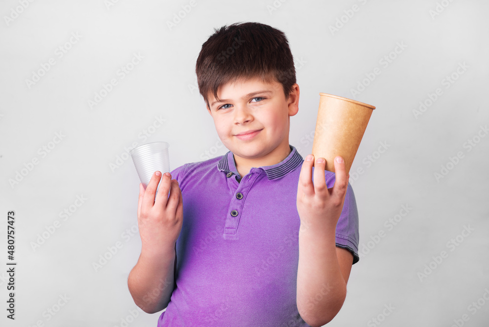 The teenager holds a plastic and a paper drinking cup in the hands. Promotion of non-use of plastic. Zero waste concept