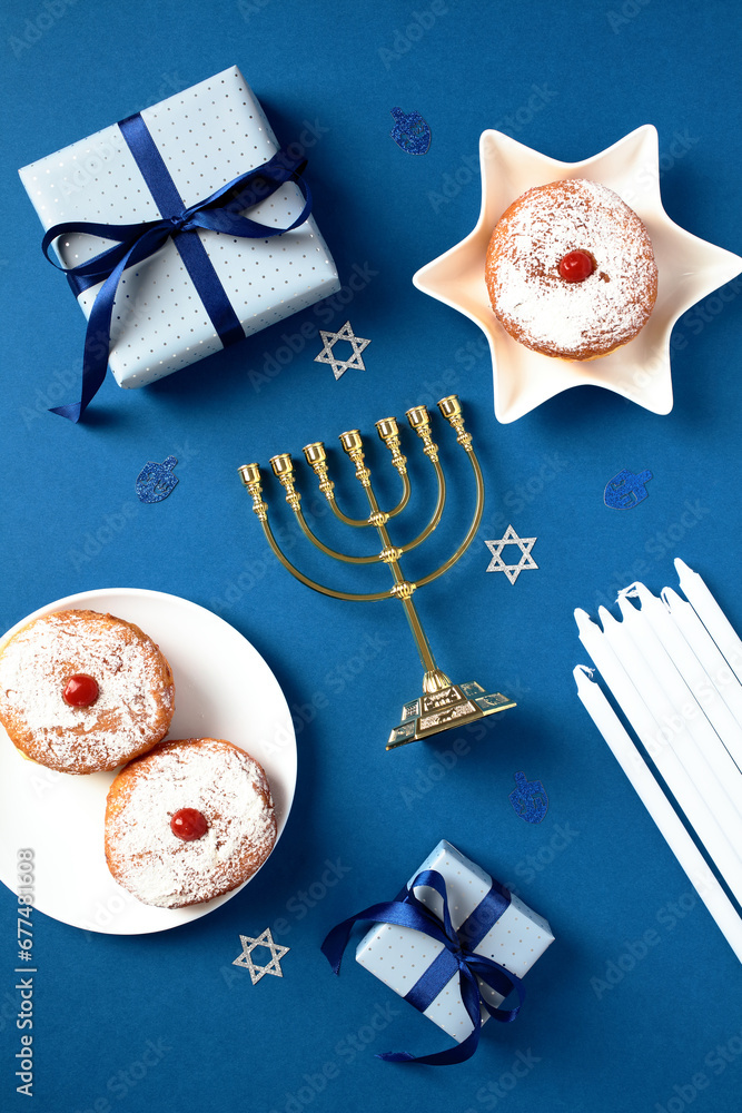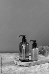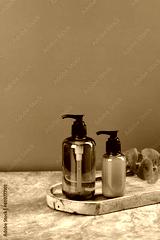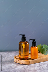 Set of natural organic SPA beauty products on wooden board with eucalyptus. Amber glass dispenser bottles with green leaves on dark blue background.