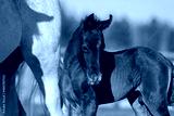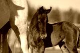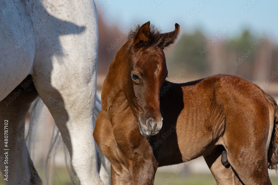 Young pretty arabian horse foal and his mother on summer background, portrait closeup