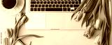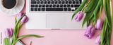 Banner made Workspace with laptop, tulip flowers, cup of coffee on pink background. Home office desk. Flat lay, top view, copy space for text. Spring concept.