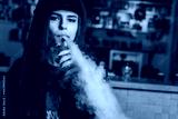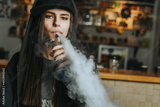 Young pretty woman in cap smoke an electronic cigarette at the vape shop. Hip-hop style. Closeup.
