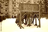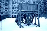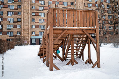 Wooden slide in the courtyard of a multi-storey residential building on a winter day