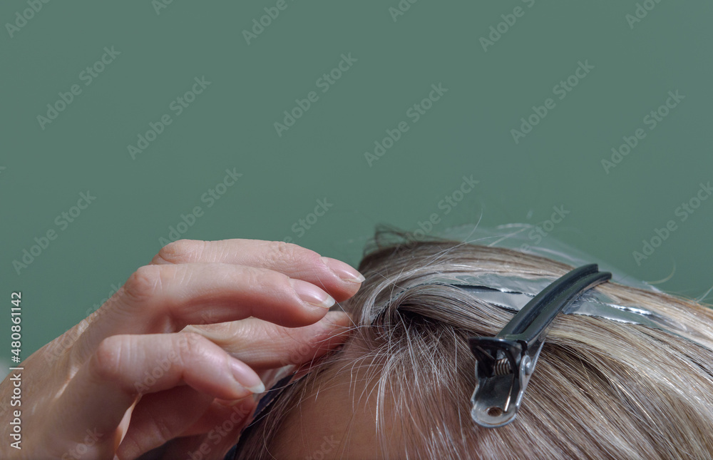 Position of fixing the hair on the head during the dyeing process. Close up. Green background