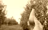 Ripe pear in a man's hand against the background of pear trees fields and blue sky. Selected focus