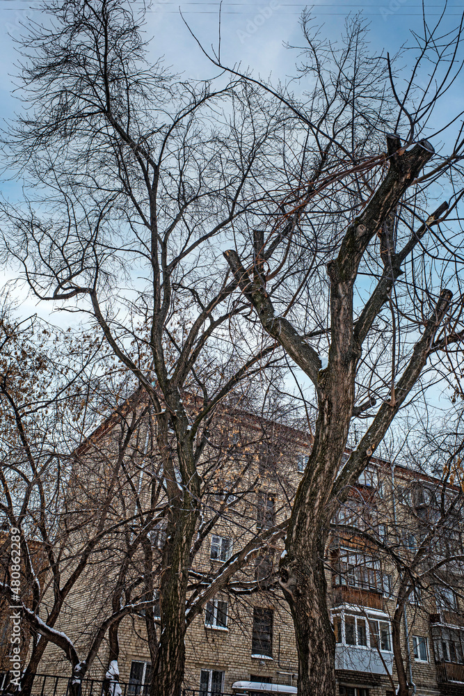 Trees without leaves on the background of an apartment building on a winter day