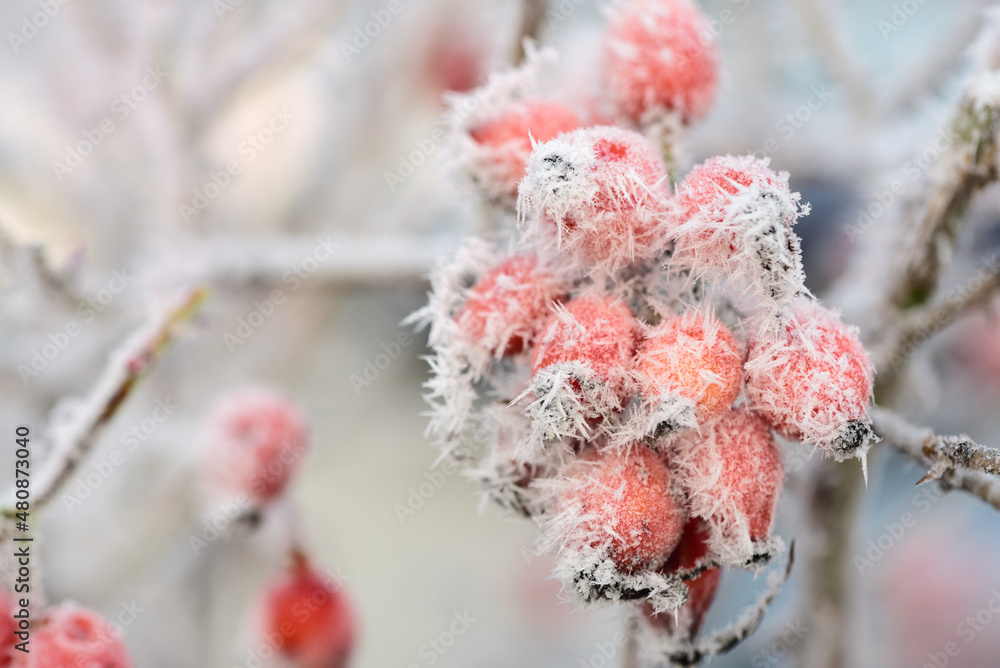 closeup of red rose hips growing on the bush covered with ice crystals in winter in horizontal format