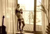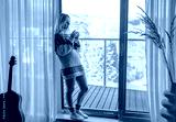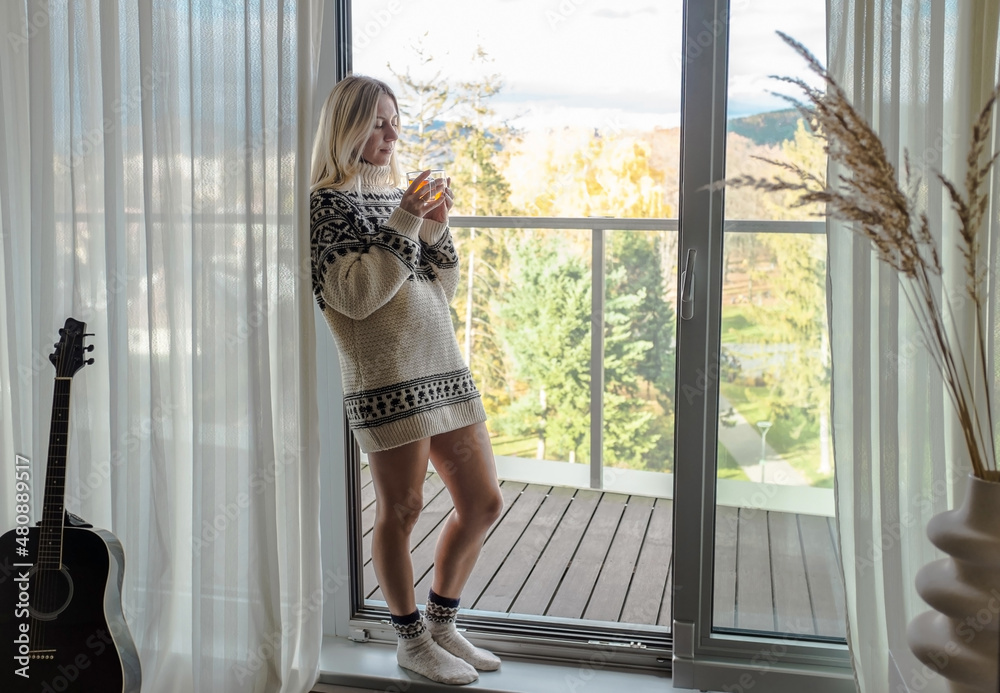Woman in knitted wool sweater drinks tea a cup, relax at home in winter day. Health care, authenticity, sense of balance and calmness. Fresh air.