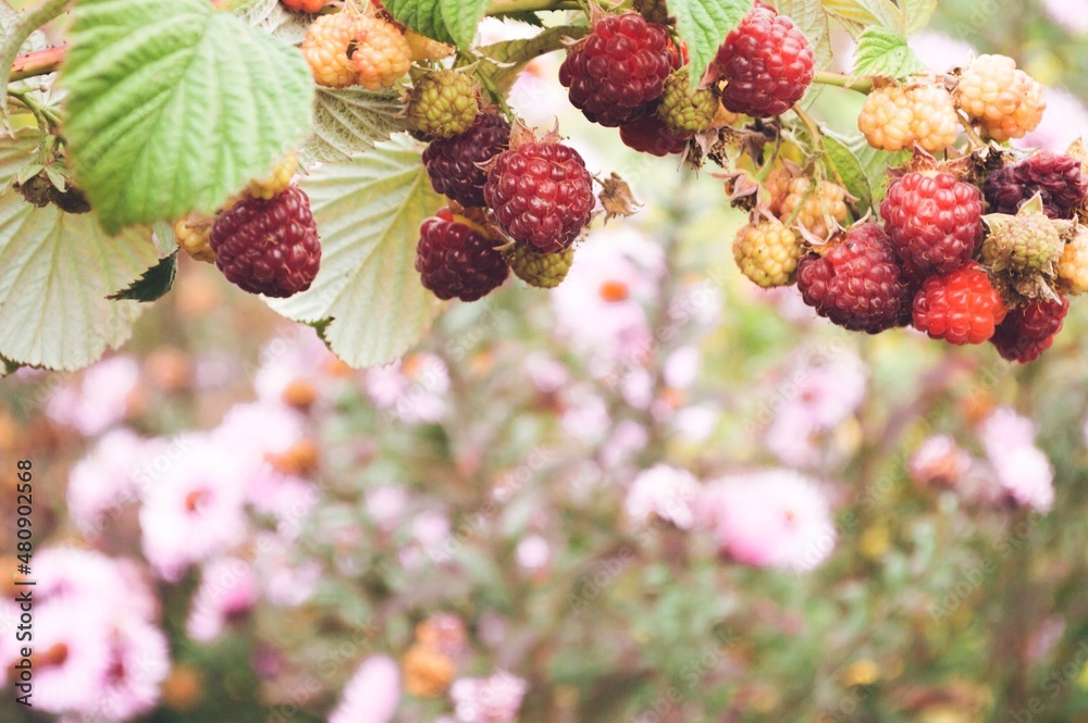 Red ripe raspberries on branches, blurred background with purple