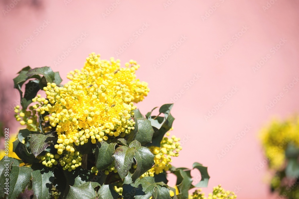 Spring flowering of Magone Holm, Mahonia aquifolium, evergreen s