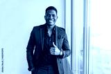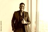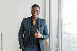 portrait of handsome cheerful african man in suit with hand gesture