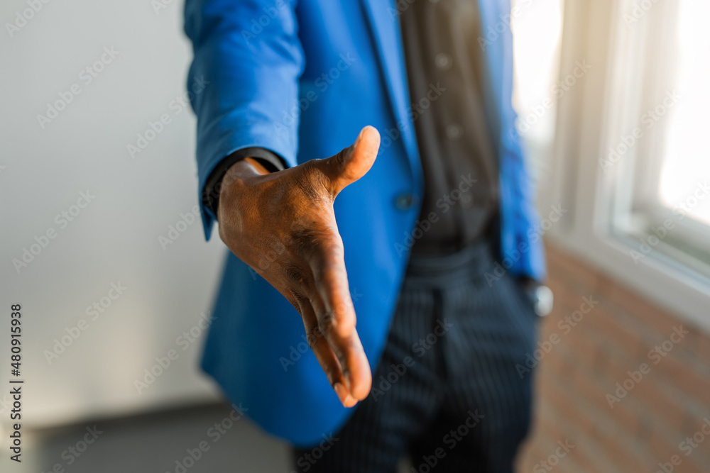 African man's hand greeting gesture in a suit