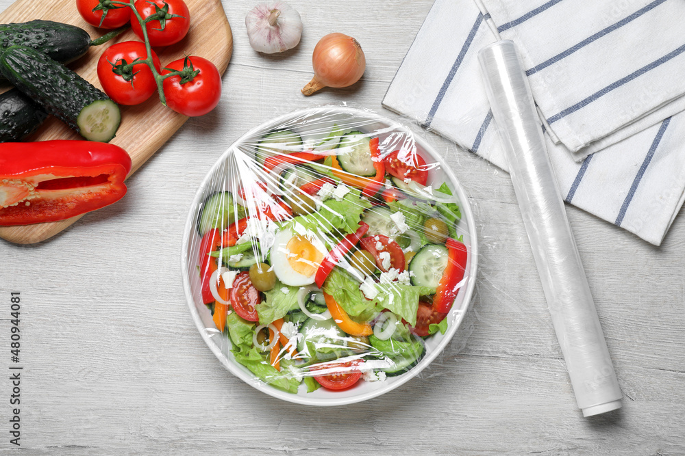 Bowl of fresh salad with plastic food wrap on white wooden table, flat lay