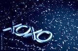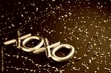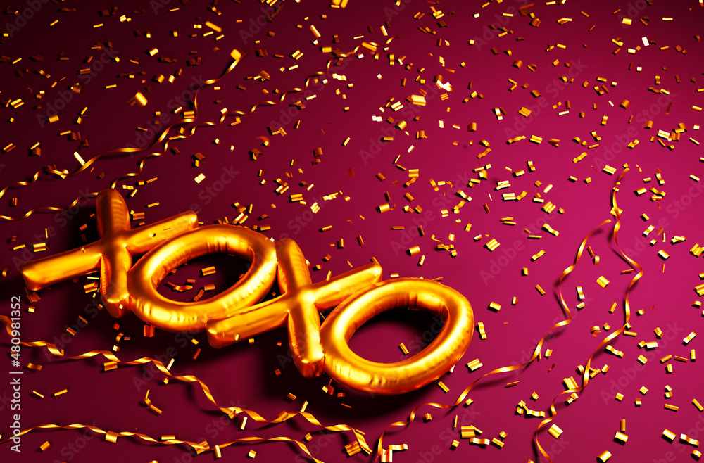 Golden xoxo foil balloon on pink background with gold glitter confetti. Top view. Valentine's day background. Celebration party romance dating special occasion greeting card.