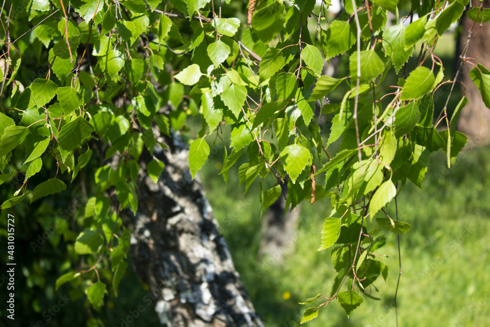 Birch branch in the forest in the sunny day. Close-up. Natural background.