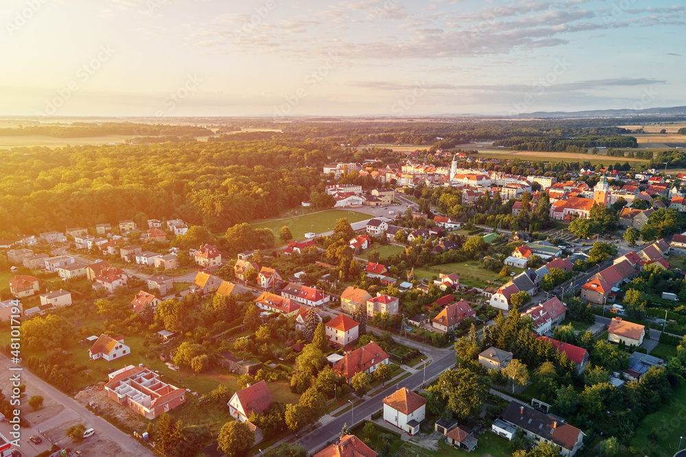 Aerial view of suburban neighborhood, Residential district with buildings and streets at small european town at sunset