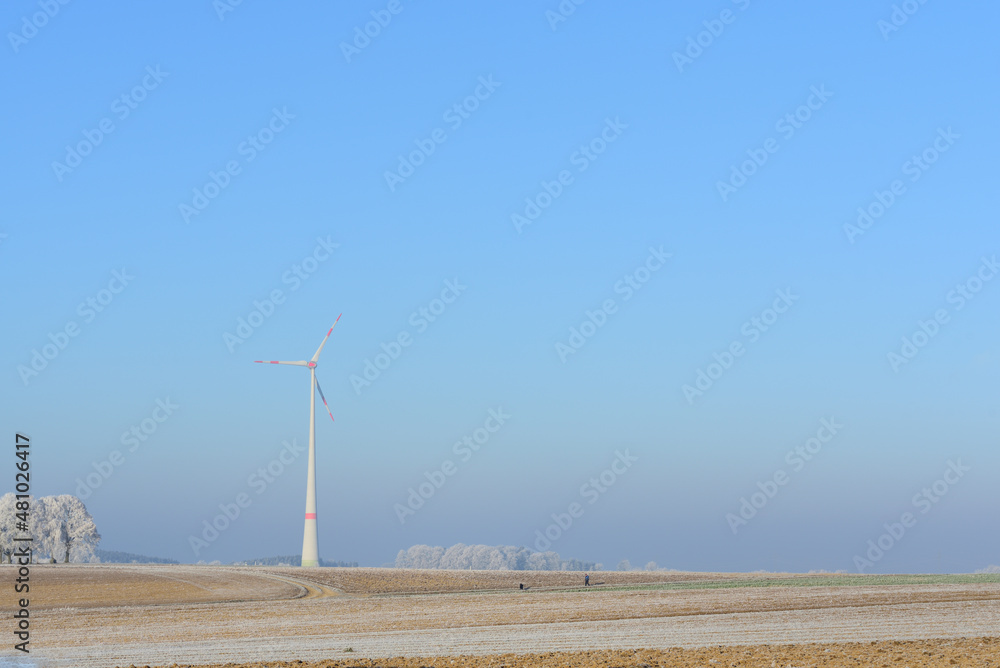 Scenic shot of a winter day in Bavaria, with wide fields covered in frost, the blue sky in the background and a large windmill for generating electricity