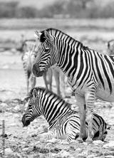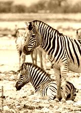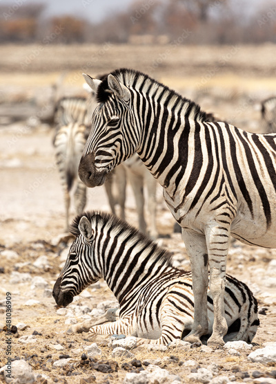 Two zebras in the Etosha National Park. A zebra foal is sitting and an adult zebra is standing. Namibia.