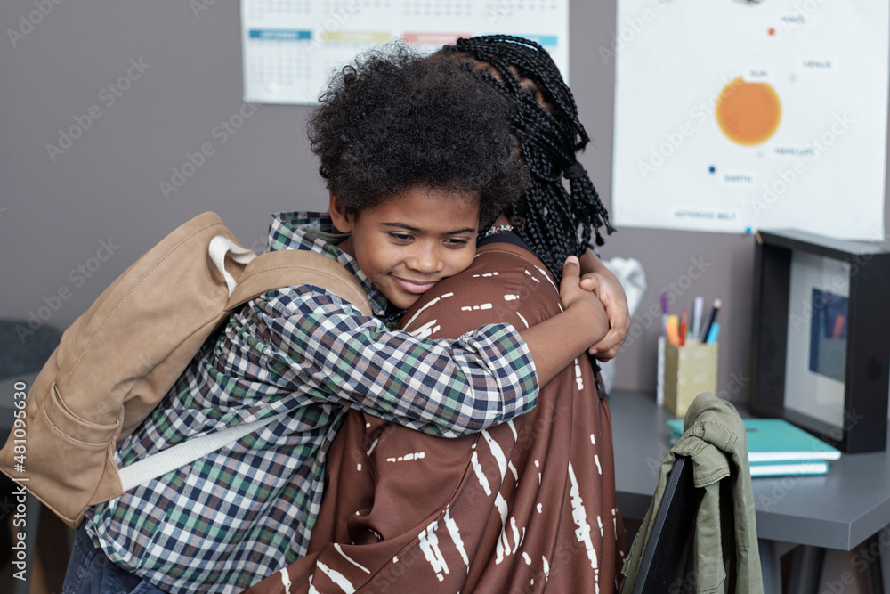 Happy affectionate schoolboy with backpack giving hug to his mother while getting ready for school in the morning