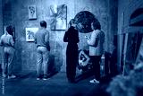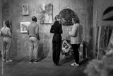 Young blond woman in black casualwear talking to mature elegant man among visitors of contemporary art gallery