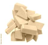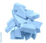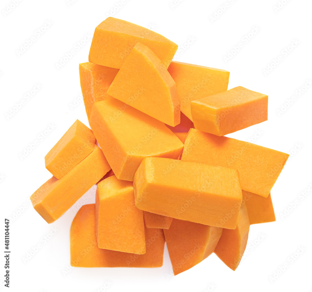 Sliced pumpkin pieces isolated on white background. Diced Pumpkin cubes. Top view. Flat lay.