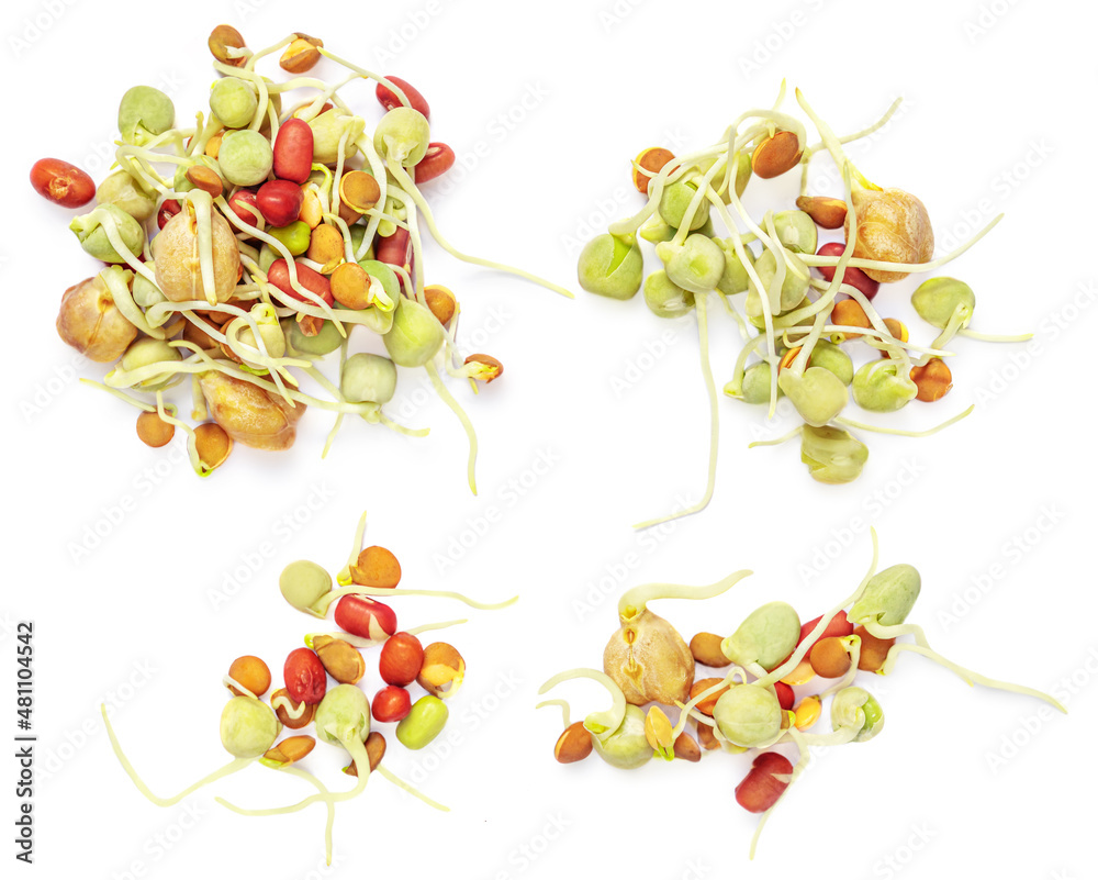 Bean sprouts isolated on white background. Vegan, raw food diet concept. Flat lay. Top view.