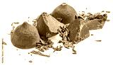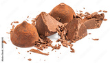 Chocolate truffles candies covered with cocoa isolated on white background. Truffle whole and bitten pieces top view