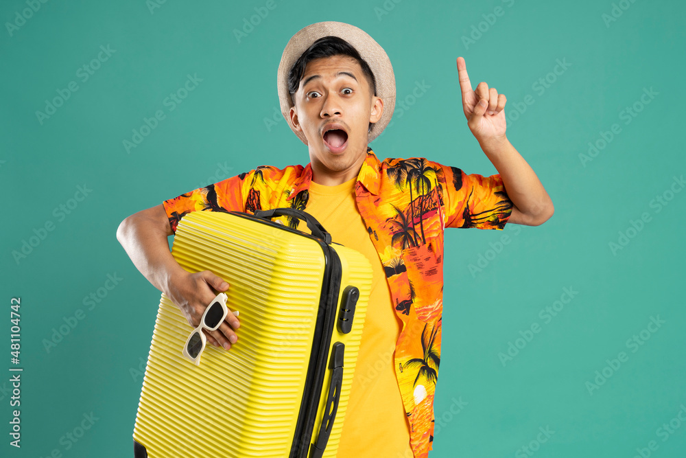Young man with idea gesture over isolated background in vacation with travel suitcase