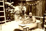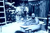 young brutal bearded tattoo man sit in bath with hot water on the snow near porch of country house with wooden fence decorated to celebrate Valentine's Day in suburbs