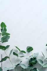 Green eucalyptus branches on marble stone desk table. Frame made of eucalyptus leaves. Wedding invitation design.