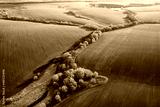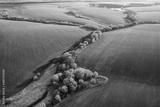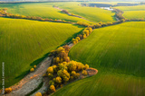 Bird's eye view of abstraction agricultural area and green wavy fields in sunny day.