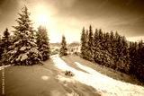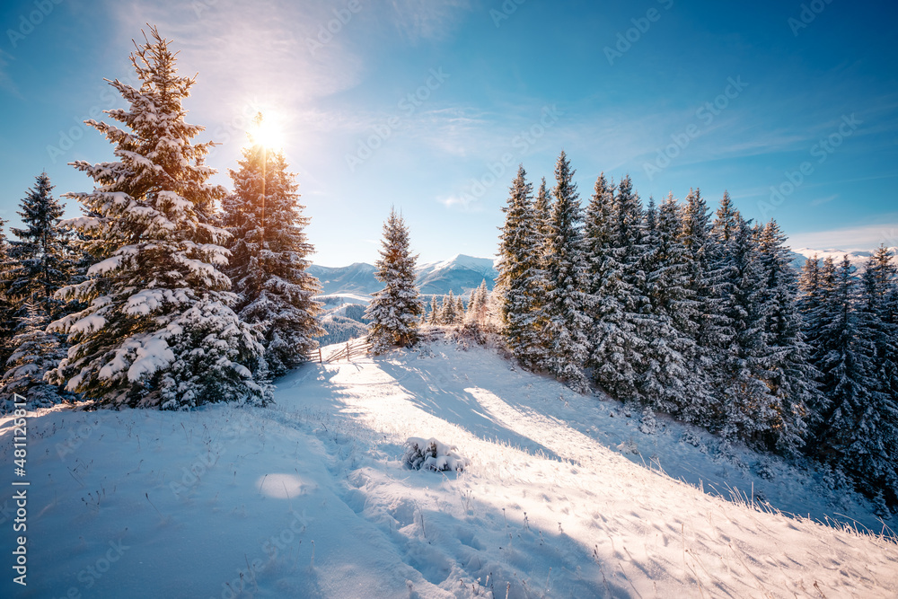 Gorgeous image of snow-capped mountains after a heavy snowfall on frosty day.