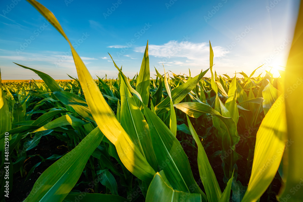Field of young corn on a sunny day with perfect sky. Ukrainian agrarian region, Europe.