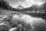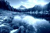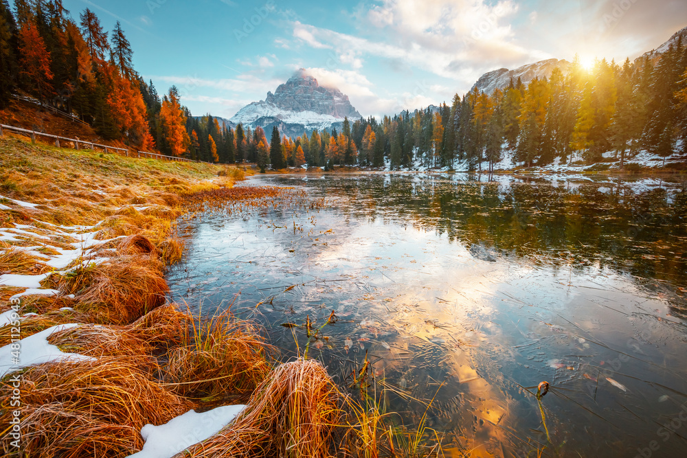 Fantastic sunny day on the lake Antorno in National Park Tre Cime di Lavaredo. Italian alps, Europe.