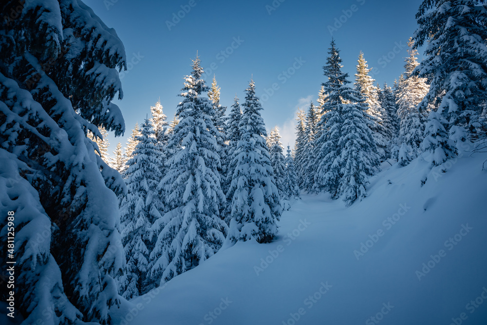 Gorgeous snowy landscape and Christmas trees on a frosty sunny day.