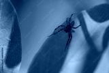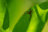 Włochate nogi pająka na krawędzi liścia, na zielonym tle