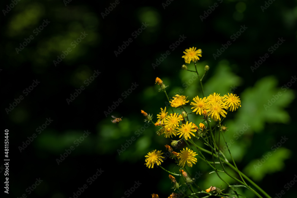 Naturalny bukiet żółtych kwiatów z nadlatującą pszczołą