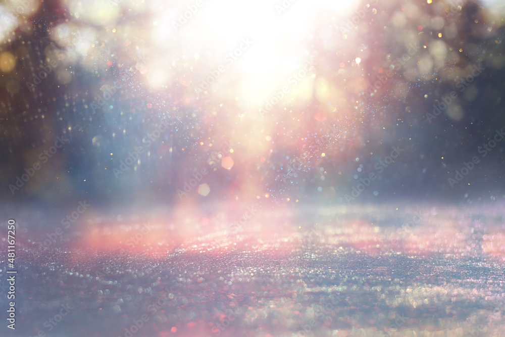 blurred abstract photo of light burst among trees and glitter bokeh lights