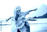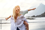 Family Enjoying, relaxing on the beach, Happy mother and son walking, playing, laughing on the beach. Mother hugging child.
