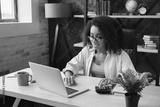 Young african student worker businesswoman freelancer counting funds domestic bills on calculator while using laptop for e-banking, paperwork, debt and loan