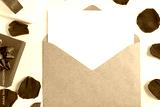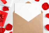 Open envelope with list on white wooden table with red rose petals and gift boxes top view. Mockup for greeting card, invitation, flat lay.