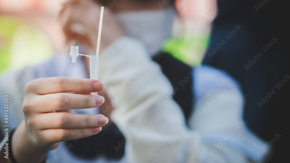Uniform girl student swab COVID-19 testing by Rapid Antigen Test kit at home with a cotton nasal swab